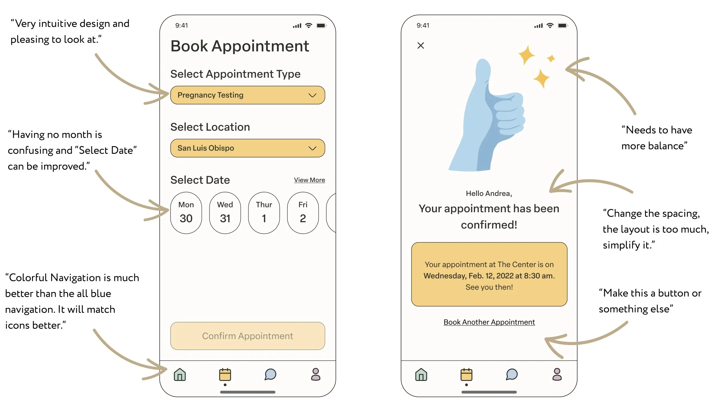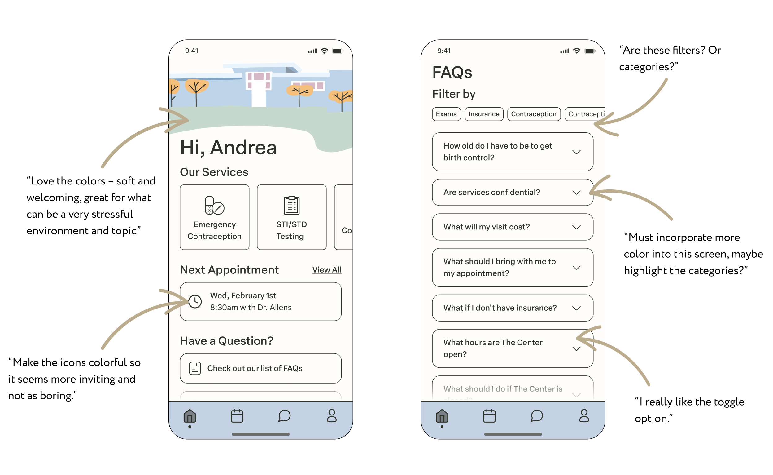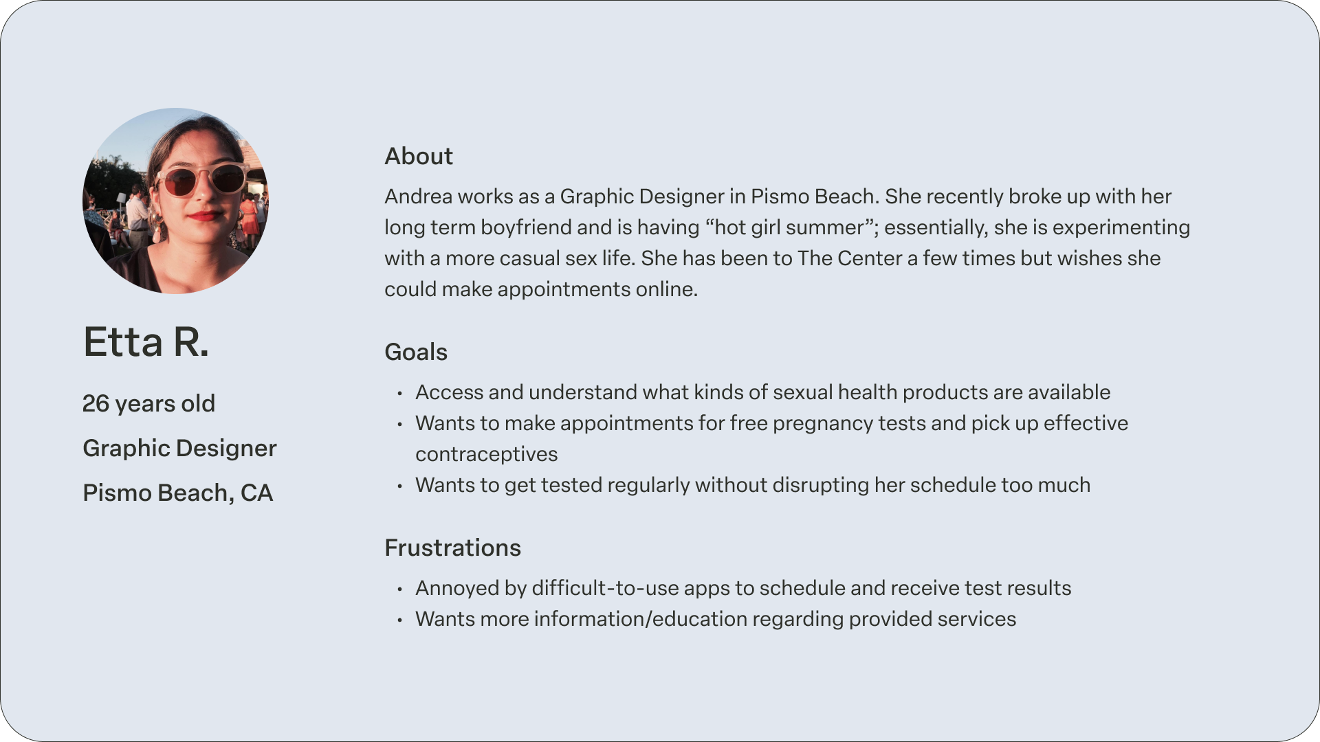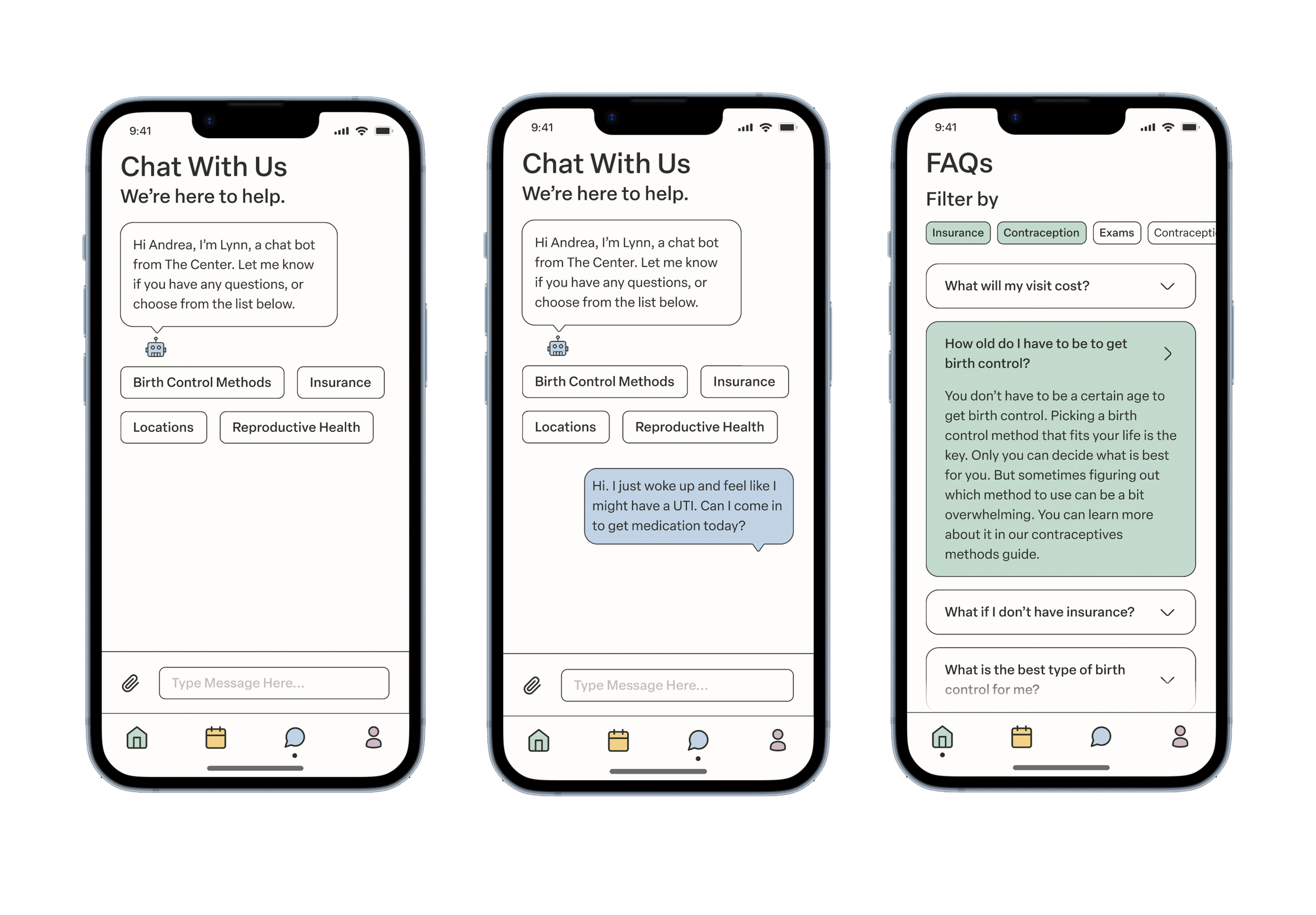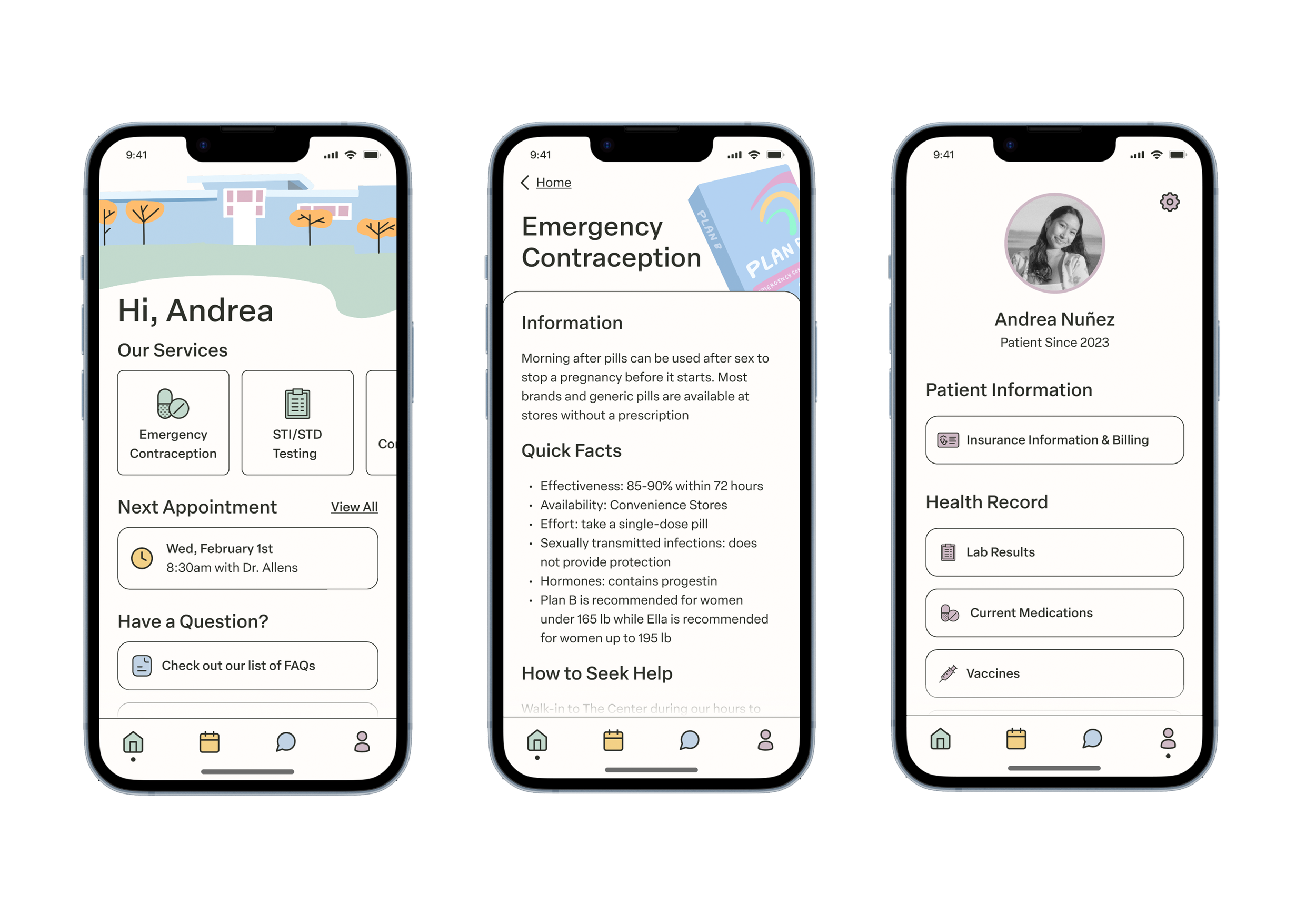 To guide our design process and identify key task flows, we created personas. We conducted research on The Center and other reproductive, sexual health and well-being clinics to gain insight into their patient base. The most insightful part of the research was when we interviewed students at Cal Poly who were patients of the Center to gain a better understanding of their needs and frustrations.