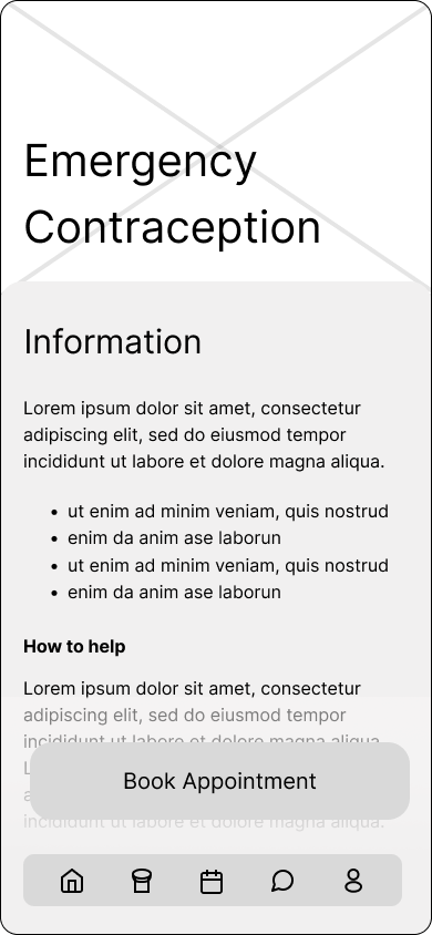 Collaboratively, we wireframed every section of the design, ensuring that each component met the users' requirements. Although all of us contributed to every screen, for time constraint purposes I mainly concentrated on the sexual health and well-being education screens, home screens, and chat bot feature.