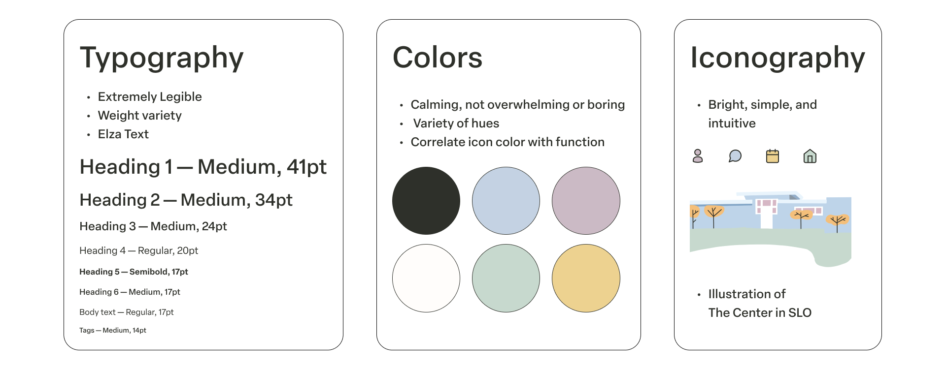 Our goal was to reflect the relaxed, inclusive, and inviting atmosphere we want our users to experience through our app's appearance. We accomplished this by selecting a typeface that prioritizes legibility and adhering to the WCAG guidelines on color and size. We opted for soft yet lively colors to convey a sense of warmth and ease.